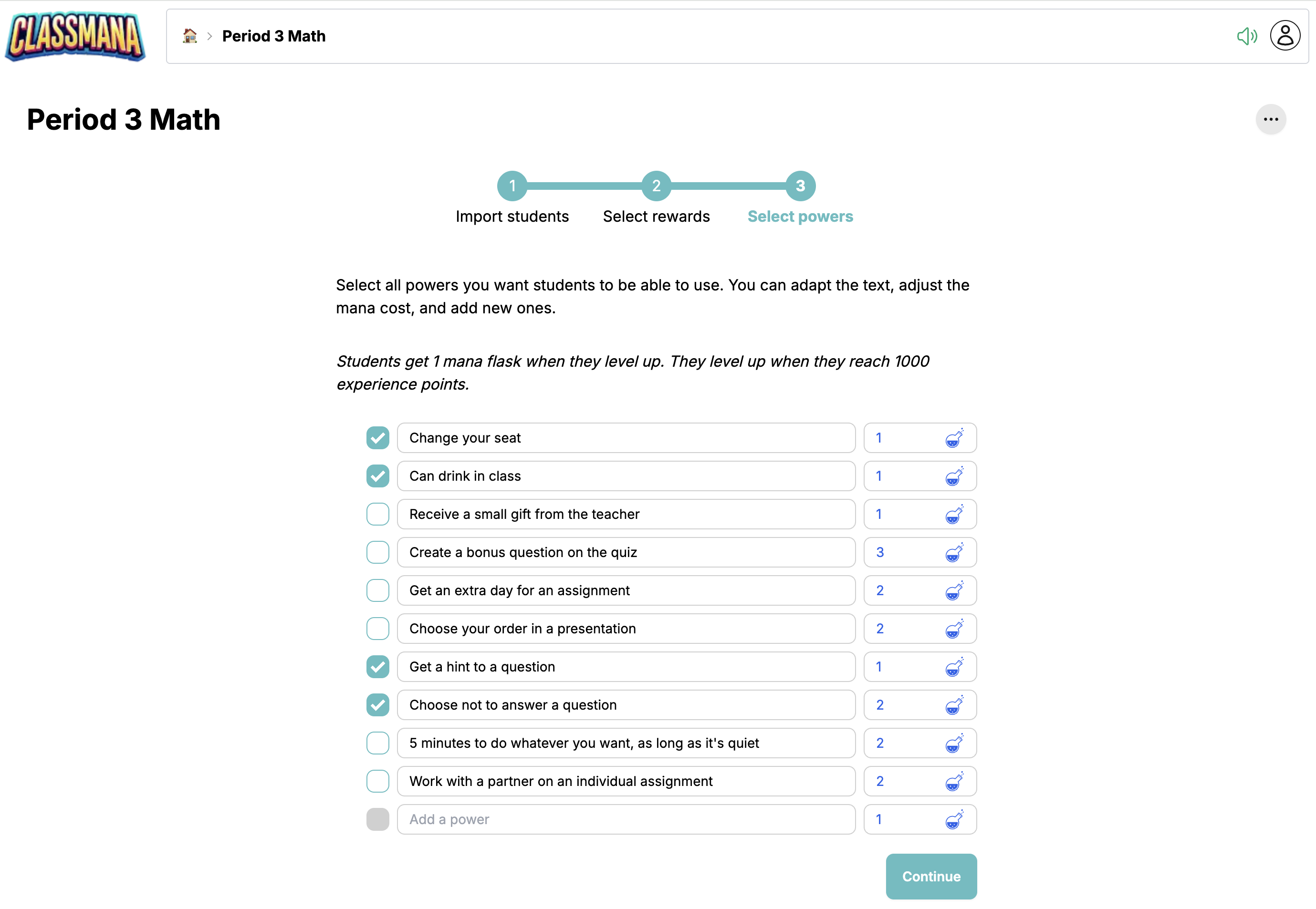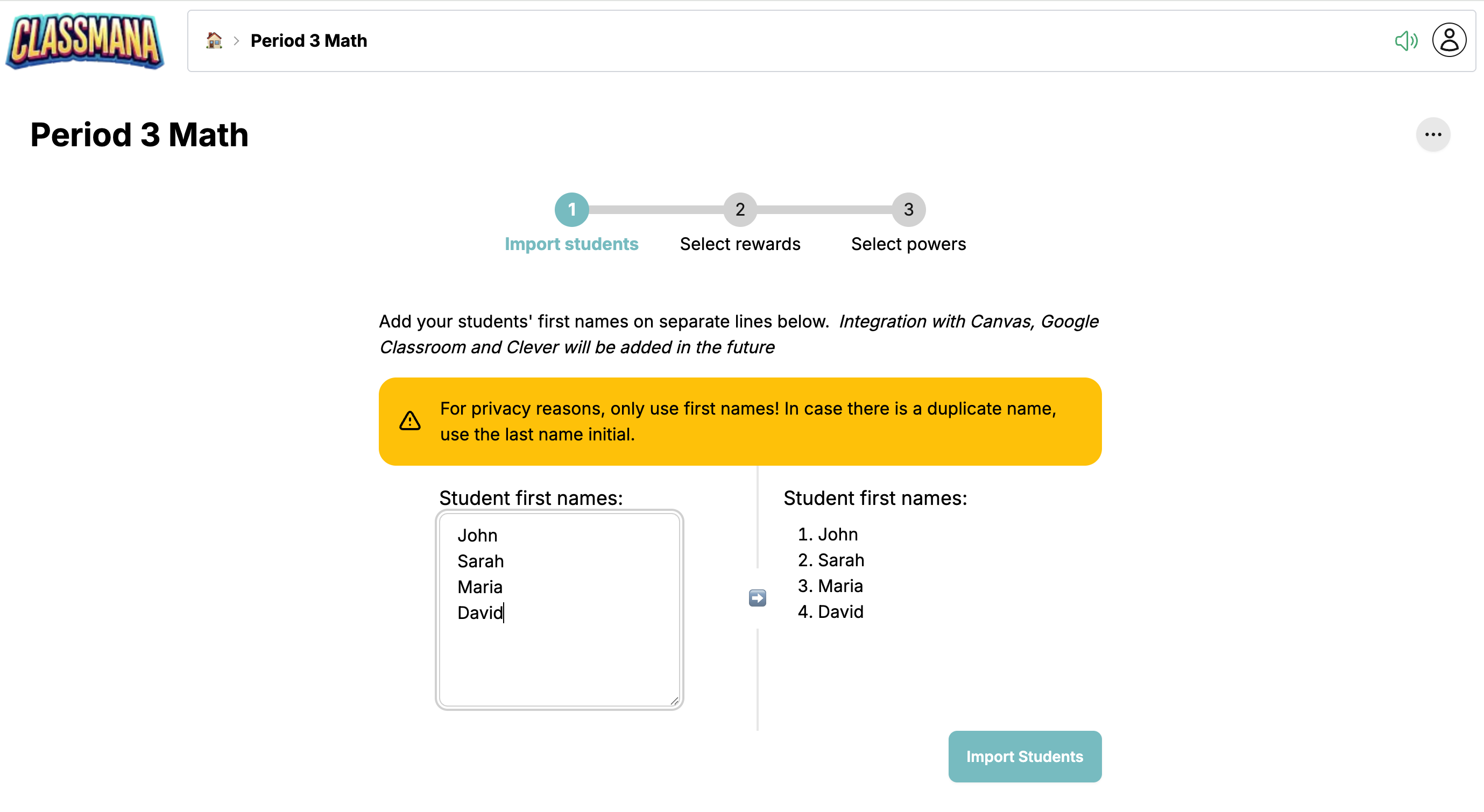 Après avoir créé votre classe, vous passerez par un assistant de configuration en 3 étapes pour configurer les élèves, les récompenses et les pouvoirs.