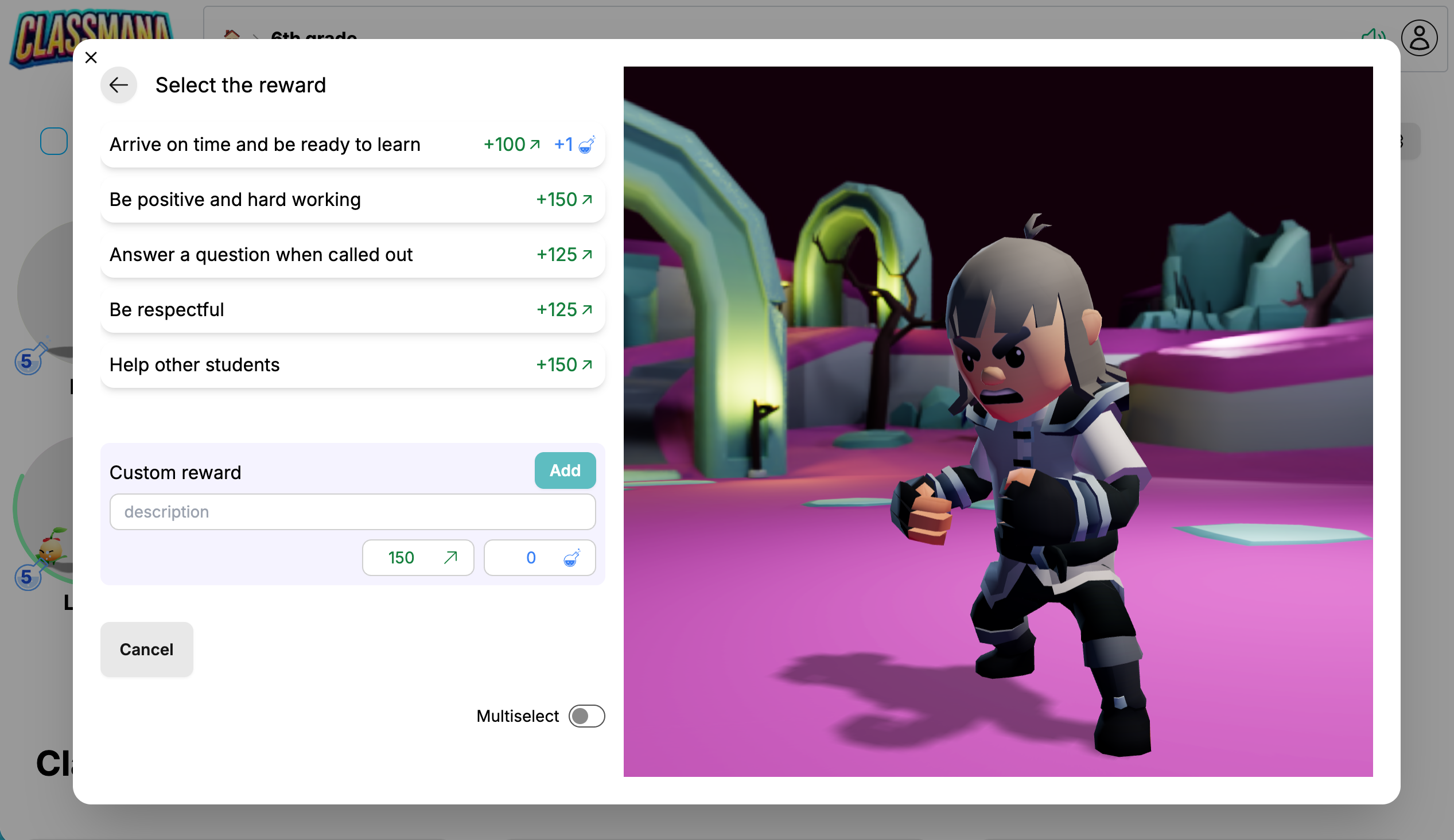 Le panneau de récompenses fonctionne de la même façon - cliquez sur une récompense pré-configurée ou créez-en une personnalisée. La récompense sera appliquée à tous les élèves sélectionnés.